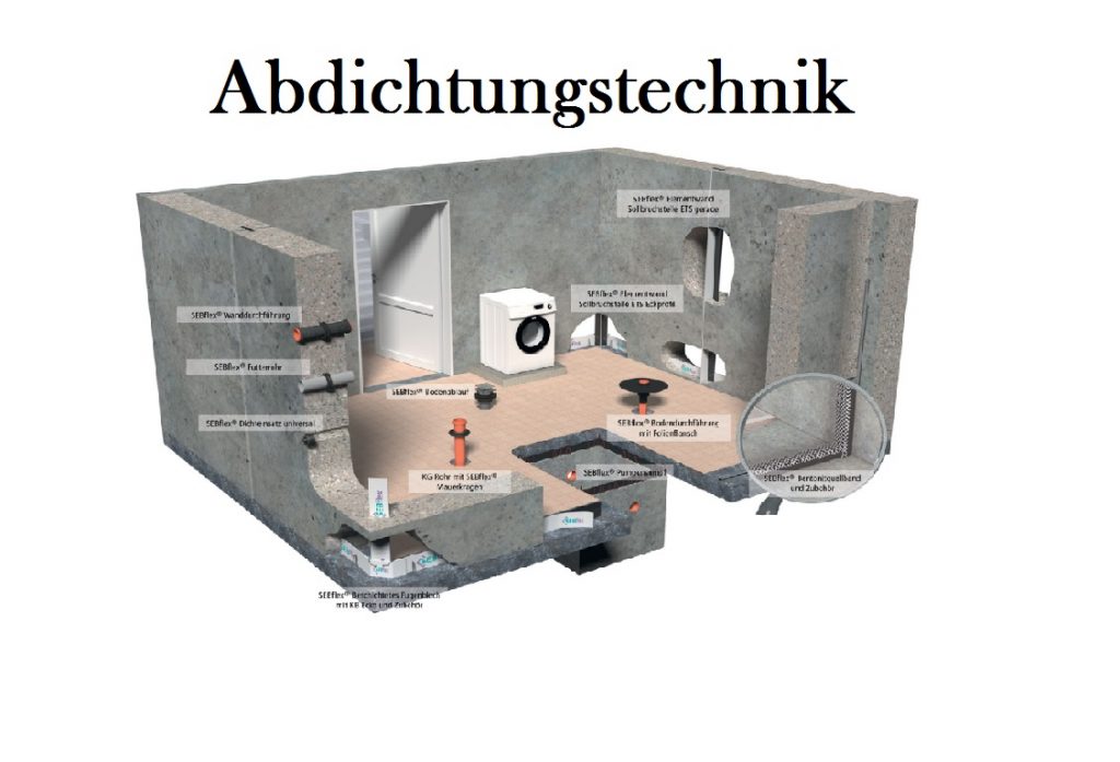Z.B. Fugenbleche mit Polymerbitumen- oder Kautschuckbeschichtung und AbP, Quellbänder, Injektionsschläuche, Fugenbänder und mineralische Abdichtungssysteme.